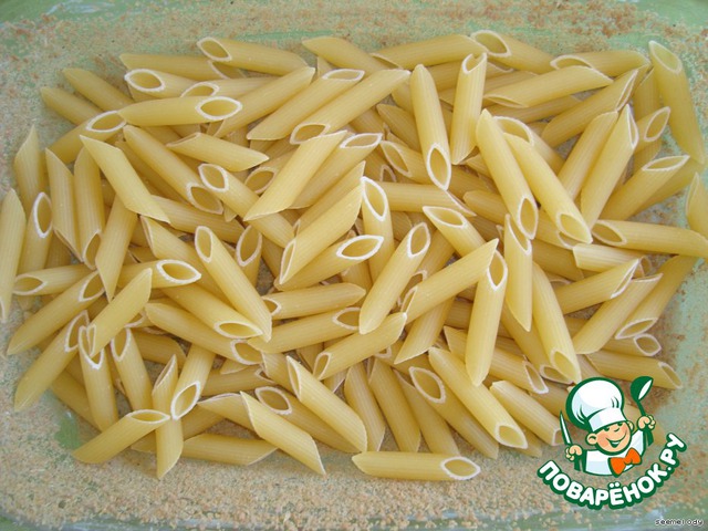 2. Насыпать в форму сухие макароны-пенне. Макароны предварительно НЕ надо отваривать.