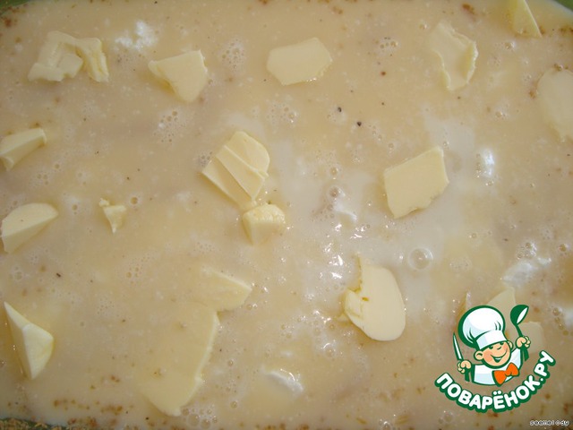 6. Сверху порезать кусочками сливочное масло и равномерно распределить (можно заменить оливковым)
