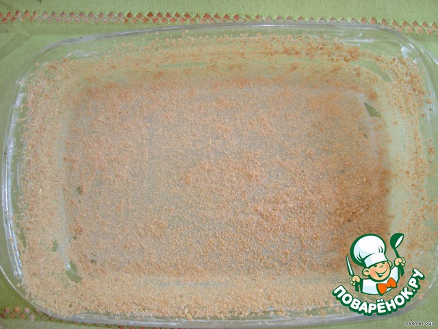 1. Форму 22*30 смазать сливочным маслом и посыпать панировoчными сухарями.