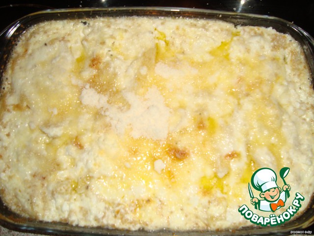 7. Поставить в разогретую духовку. Через 20 минут вынуть форму и надрезать, чтобы масло протекло вниз. Посыпать сверху тертым сыром (я брала Грана Падано) и отправить еще на 30 минут в духовку. Если верх будет подгорать (хотя у меня такого не было) накройте пищевой фольгой.