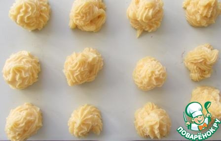 Переложить картофельное пюре в кондитерский мешок или шприц и отсадить на промасленную бумагу для выпечки, на силиконовый коврик или прямо на смазанный маслом противень "розочки". Поставить в горячую духовку (220 град.) и запекать до золотистости.