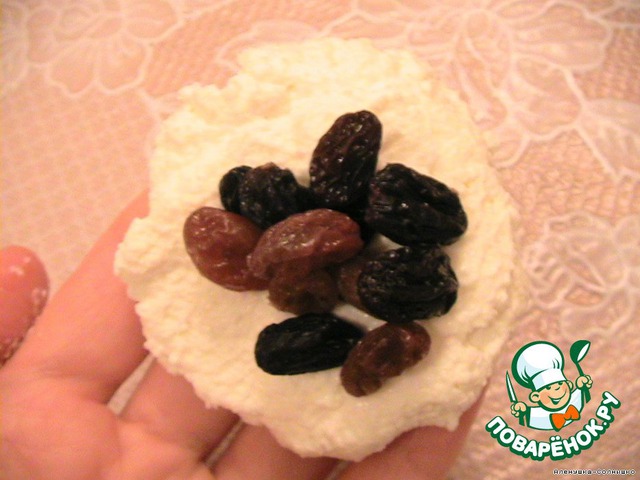 Изюм промыть, обдать кипятком. Разделить тесто на кусочки, в каждый из которых положить по несколько изюминок.
