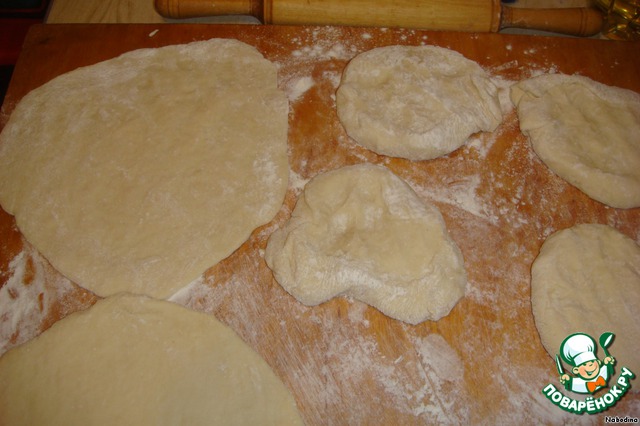 Разделяем тесто на 7-8 равных частей и раскатываем круги толщиной, примерно, 2 мм и кладем на лист, смазанный маслом. Выпекаем 10-15 минут.