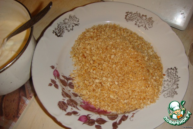 Ровняем коржи, обрезая бока. Обрезки измельчаем в крошку.