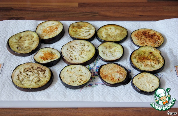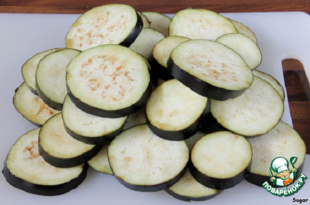 Баклажаны нарезать кружочками толщиной 1 см, посолить и оставить на 30 минут.