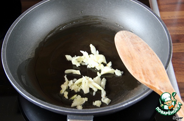 Поджарить чеснок до легкого золотистого цвета на оливковом масле.