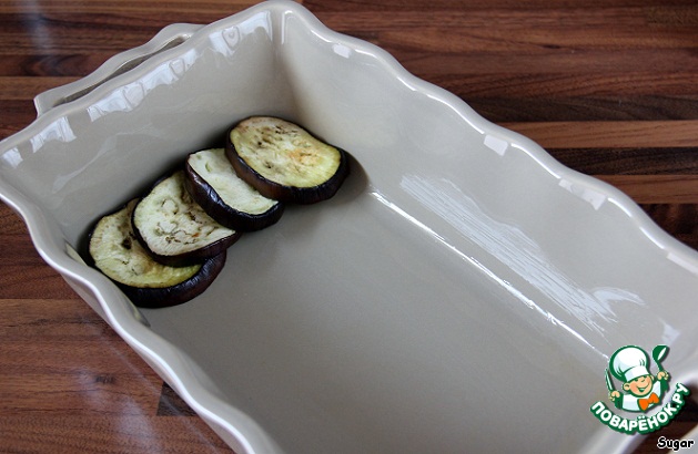 Форму смазать оливковым маслом, выложить ряд баклажанов.