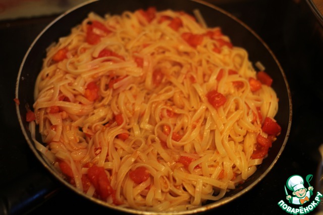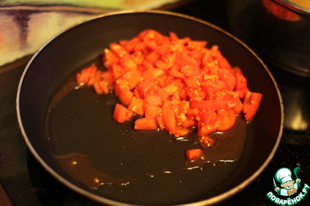 Нагреваем нарезанные помидоры без кожицы на сковороде, добавляем чеснок (наслаждаемся ароматами).