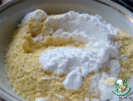 Добавляем кефир, в него - соду /я вообще не пользуюсь пекарским порошком, а если вы его используете – добавьте в смесь кукурузной муки и крахмала./