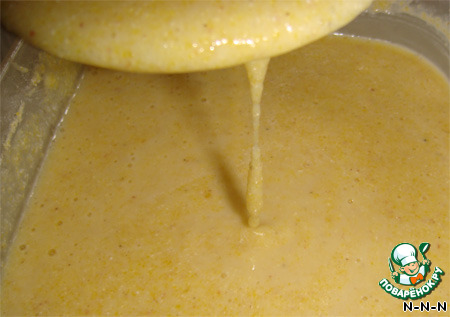 В кефирно - яичную смесь по-немного всыпаем муку с крахмалом. Хорошенько перемешаем. Как видите – тесто относительно жидкое. Если вас вдруг отвлекли – не забудьте перемешать готовое тесто, т.к. кукурузная мука тяжелая и оседает на дно.
