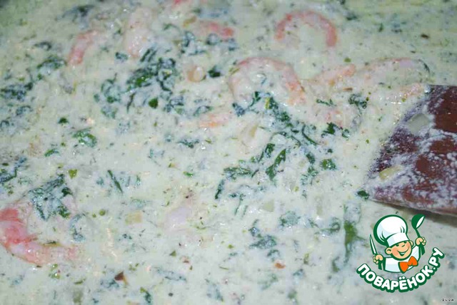Добавляем сыр к сливочному соусу,солим.Добавляем мускат и креветки. Постоянно мешаем до легкого загустения.