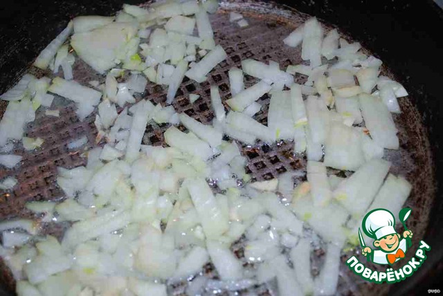 Лук нарезаем квадратиками и жарим на сл.масле до золотистого цвета.