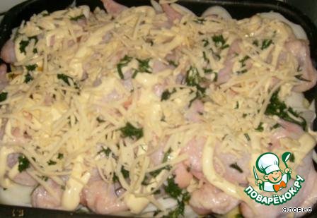 Кладем на овощи крылышки или окорочка.