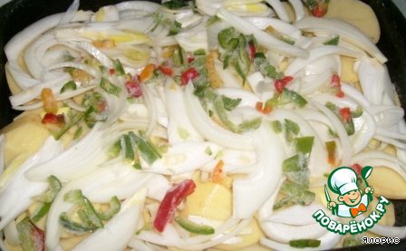 Сверху выкладываем крупно порезанный лук и перец свежий или замороженный.Заливаем молоком.