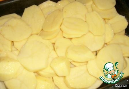 В форму налить немного растительного масла, выложить порезанный широкими, но тонкими пластинками картофель, солим.