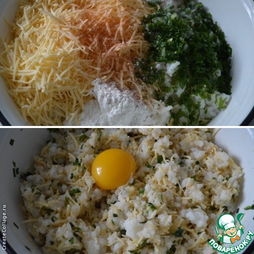 Рис заранее отварить, остудить. Сыр натереть на средней терке. Зелень измельчить. Соединить рис, сыр, зелень, муку, соль, перец и паприку. Добавить желток, хорошо перемешать.