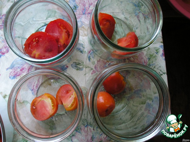 В стерилизованные баночки уложить промытые, без оснований от хвостиков помидорки. Маленькие можно и целячком, средние - пополам.