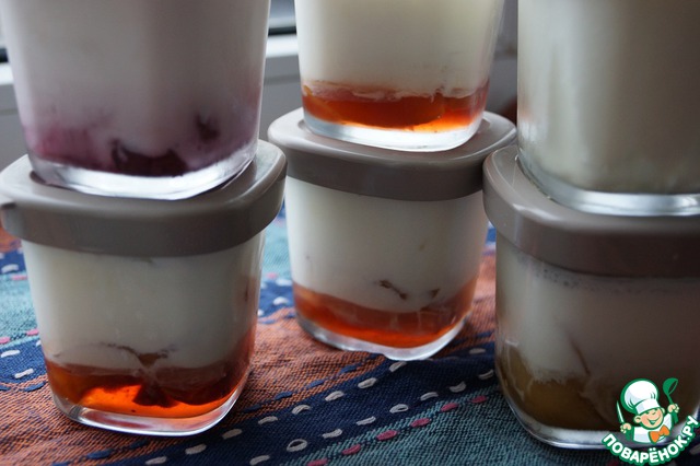 Если вы делаете в термосе, переложите готовый йогурт из термоса в стаканчики, по желанию добавляйте варенье или джем.