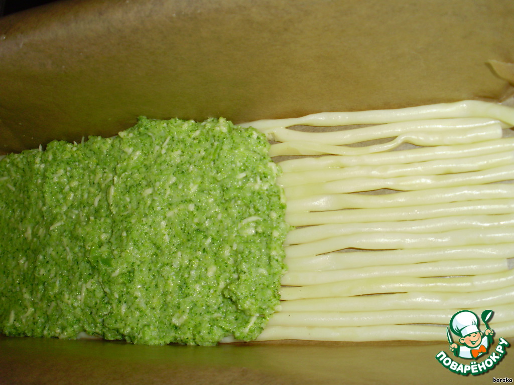 Верх должен быть покрыт пюре из брокколи. Залить оставшимися сливками и запекать 40 минут при 180°C.