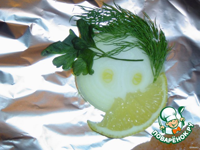 На фольгу выкладываем лук, зелень и небольшой кусочек лимона