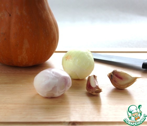 Обжарить лук в сковороде с разогретым оливковым маслом. Добавить тыкву, чеснок и карри, обжарить на сильном огне до золотистой корочки 5 мин.