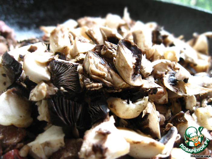Моем куриную печень и режем кусочками. Поджариваем на сковородке до полуготовности.