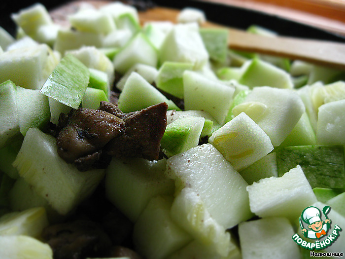 Кабачок нужно порезать кубиками и тоже бросить в сковородку.