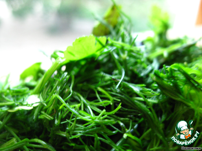 Кладем мелко посеченную зелень. Солим и приправляем специями.