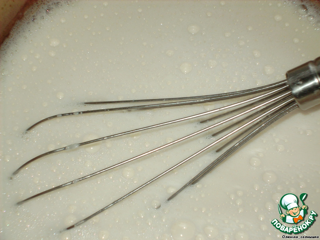 Полученную смесь вливаем в молоко и взбиваем венчиком, можно и миксером, только на минимальных оборотах
