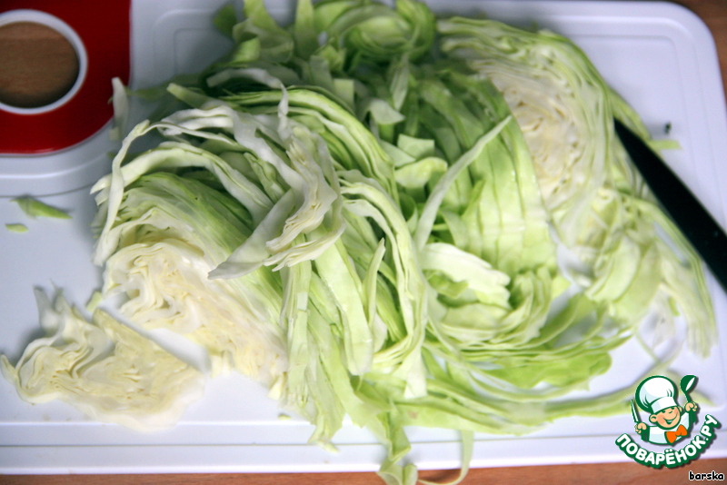 Мелко нашинковать капусту и отварить её до готовности в слегка подсоленной воде (можно в воде с добавлением молока в пропорции 4:1).