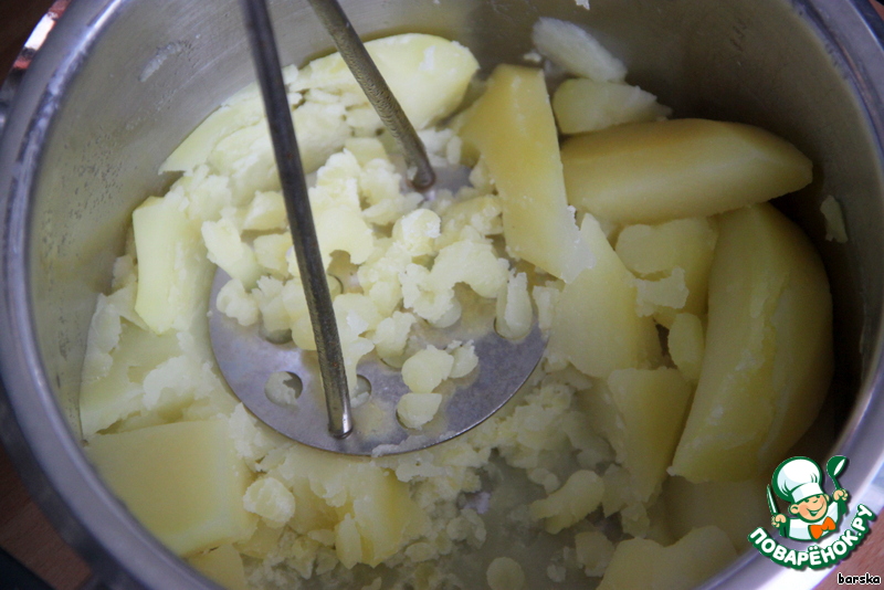 Очистить картофель и отварить его до готовности в слегка подсоленной воде. Сцедить и размять его. Добавить сливочное масло (20 г).