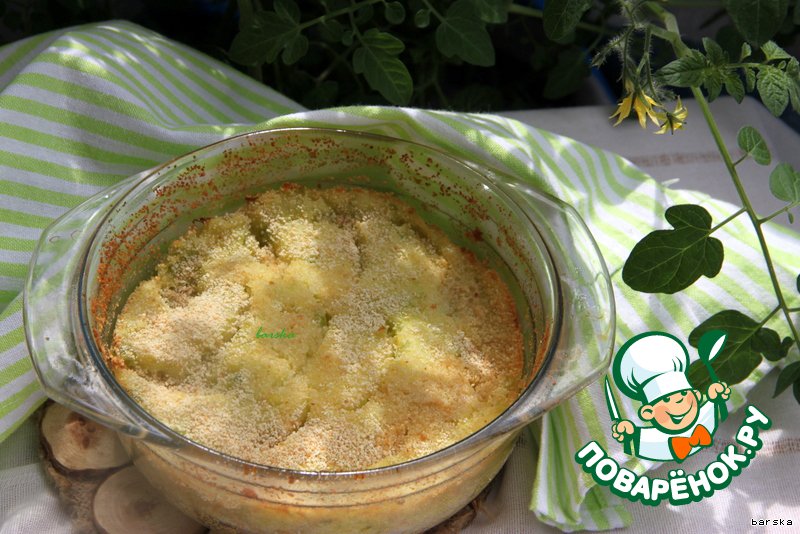 Присыпать сверху сухарями (по желанию) и полить 10 г растопленного сливочного масла или распределить сверху хлопья сливочного масла. Запекать в разогретой до 180*С духовке 20 минут.
