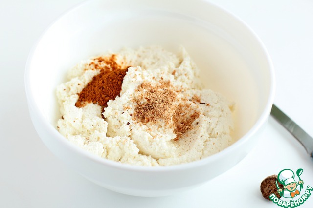 К 340 гр. творога, это солёная часть, добавим 1 ч. л. соли, мускатный орех, паприку и 2 ст. л. манки. Перемешаем. Кстати специи можно брать на ваш вкус – куркума, зира, кардамон, главное, чтоб они могли сочетаться со сладким вкусом и небыли резкими, типа чеснока, а то сладкая половина может «зарозиться» ярким ароматом.