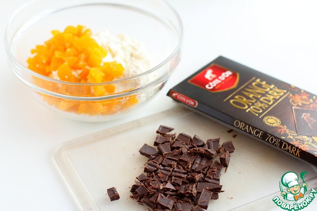 Начнём. Творог откинуть на дуршлаг и дать стечь лишней сыворотке. Разделите творог на две части на 340 и 260 г. Сладкая часть меньше весом, так как в неё добавим шоколад и сухофрукты.