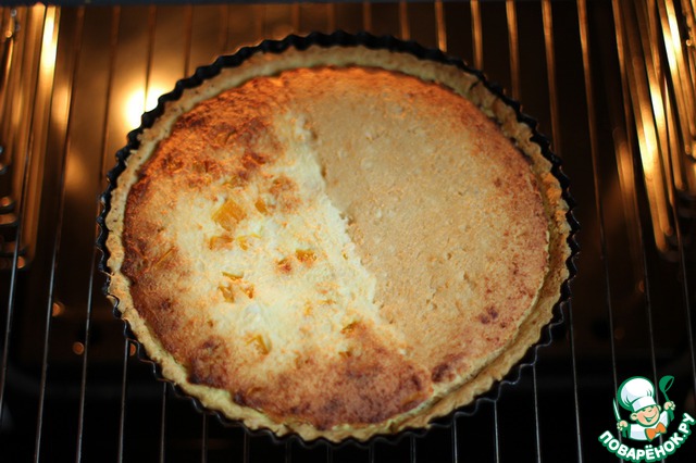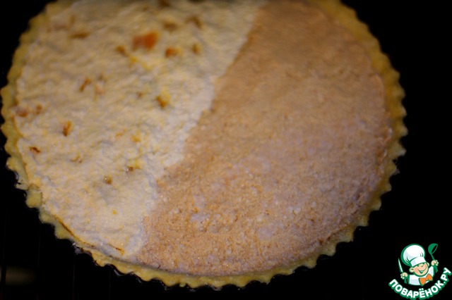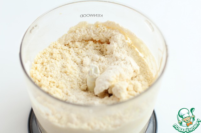 Раскатать на столе, выложить в форму и посыпать сверху манкой, чтоб она впитала влагу из начинки и тесто осталось рассыпчатым. Теперь несколько нюансов: я добавляю в тесто около 1 ч. л. куркумы, для придания золотистого цвета; в холодную воду добавляю пару кубиков льда, так получаю ледяную воду. Очень удобно месить в измельчителе, раньше делала просто руками, ведь в переводе с французского глагол sabler означает движение ладоней, которыми перетирают масло и муку.