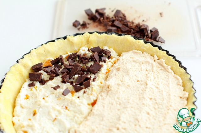 На одну половину теста выкладываем сначала солёную начинку, на другую сладкую. Шоколад можно сразу вмешать в творог с сухофруктами, но мне не нравится, что он плавится и «пачкает» начинку, поэтому я кладу его в середину, т. е. половина сладкой начинки, шоколад, снова начинка.