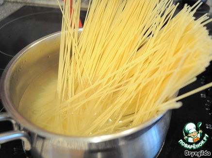 Ставлю варить спагетти, до состояния альденте, и занимаюсь поджаркой.