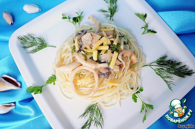 На тарелку в виде гнезда выкладываем спагетти и делаем в серединке углубление, в него выкладываем нашу поджарку, немного присыпаем тертым сыром и зеленью. И ву а ля!