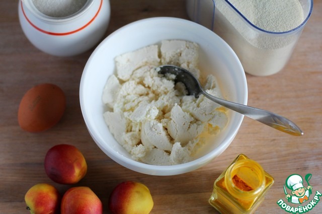 Творог смешать с яйцом, манкой, сахаром и щепоткой куркумы для придания приятного жёлтого цвета. Пока манка набухает займёмся фруктами.