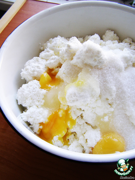 В творог добавить сахар, яйца, сливочное масло и перемешать до однородной массы. У меня объем продуктов в 2-е больше, чем указано в рецепте.