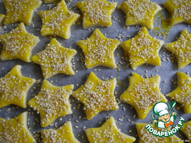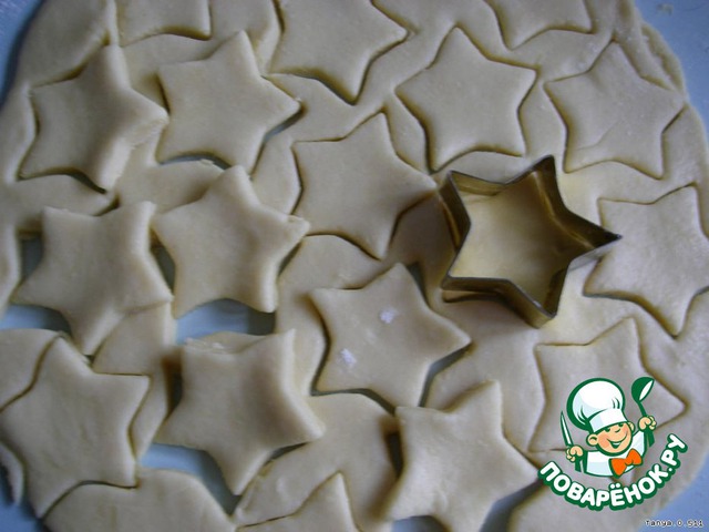 Выложить на слегка посыпаную мукой поверхность тесто,раскатать толщиной 0.5см и вырезать формочкой звездочки.