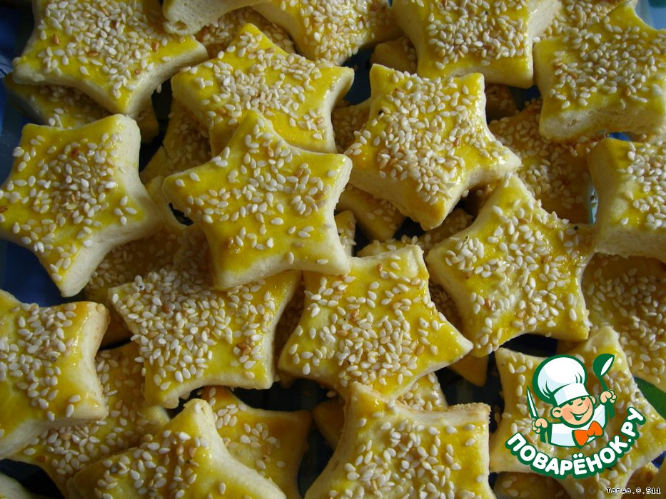 Смазать печенье взбитым желтком и сверху посыпать кунжутными семечками.