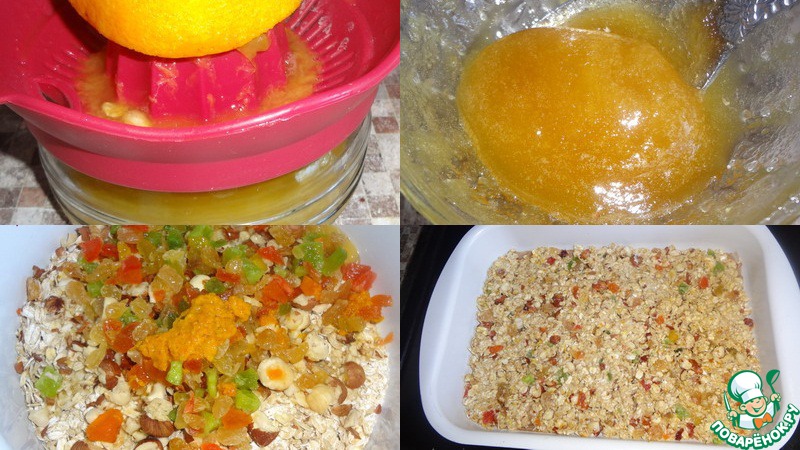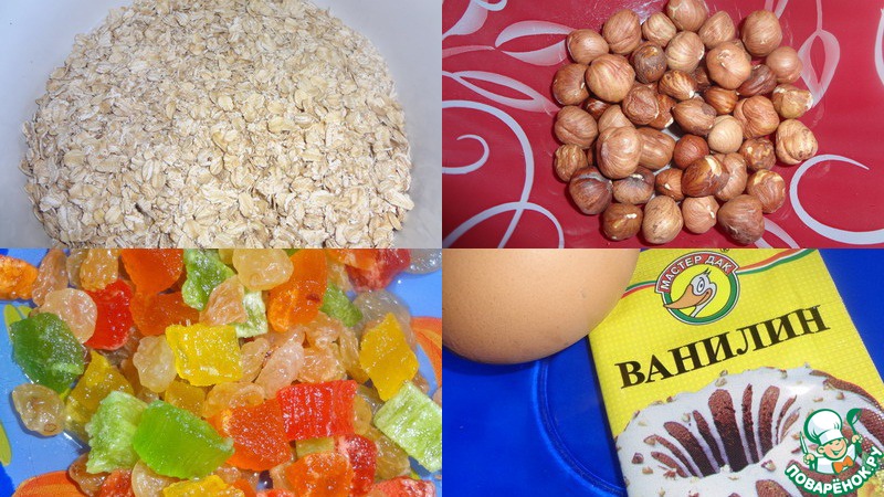 Нужно взять 150 гр. овсяных хлопьев, 50 гр. любых орехов, 100гр. любых сухофруктов (у меня был изюм и цукаты), 1ст. л. мёда, пачка ванильного сахара, 1 яйцо куриное и апельсин.
