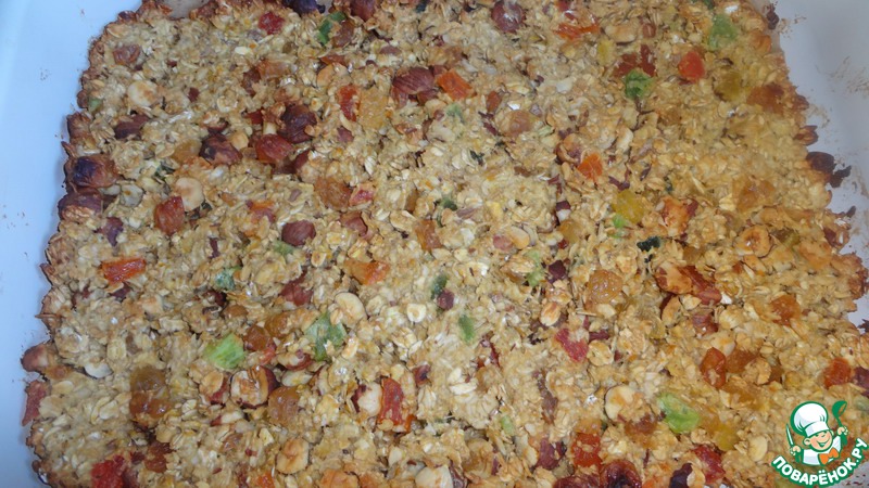 Выложить эту смесь в форму размером 20х20, разровнять и плотно прижать. Поставить в духовку, нагретую до 180град. С на 20-25 мин. Когда немного подрумянится, вытаскивать.
