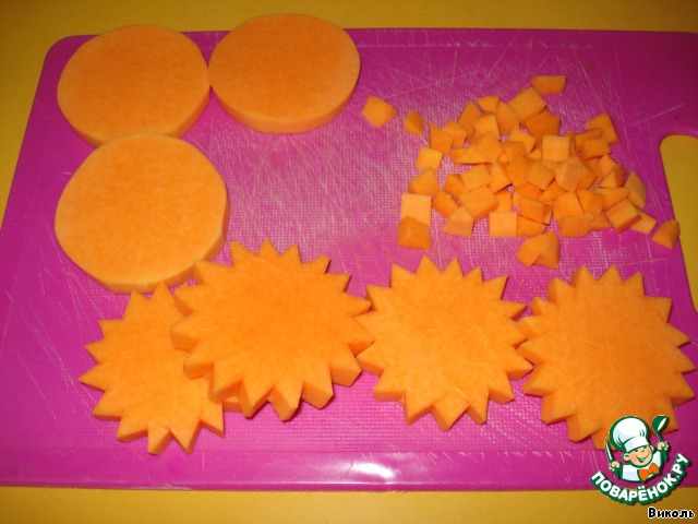 Тыкву очистить и нарезать ломтиками, толщиной около 0,5 см. В основном это занимает совсем мало времени, но сегодня я решила выпендриться для конкурса и повырезала вот такие цветочки.
