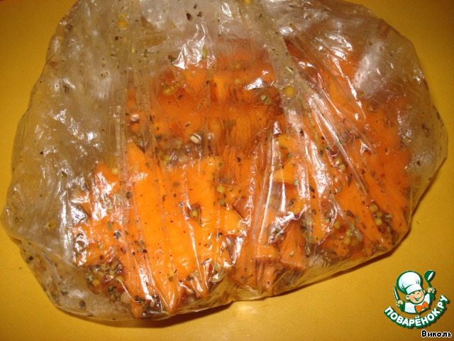 Тыкву и соус выложить в пакет и хорошенько потрясти, чтобы соус равномерно распределился по кусочкам.