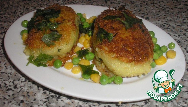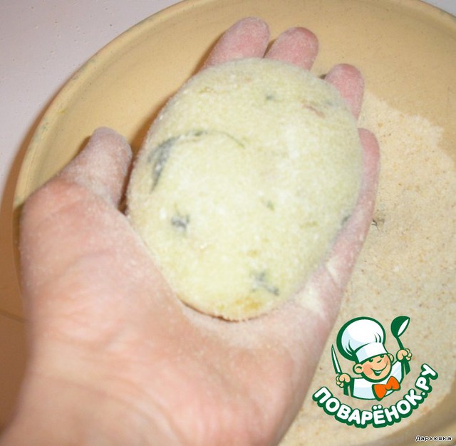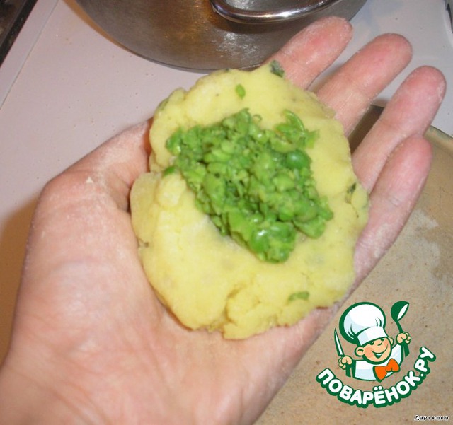 Из картофельного пюре в ладошке делаем лепешку с углублением посередине.