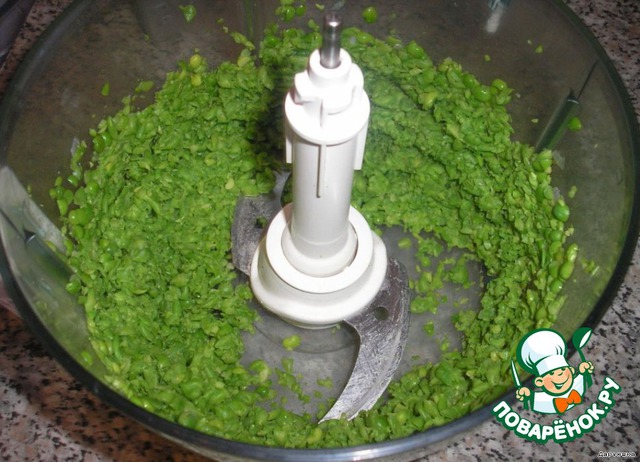 Откинуть горошек на дуршлаг. Дать стечь воде. Остудить. Измельчить в кух. комбайне.