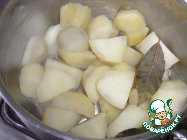 Картофель очистить, отварить в соленой воде с лавровым листом. Слить воду, дать остыть.