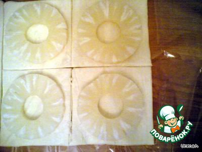 Разрезать тесто на квадраты ~ 8-10 см. Выложить на каждый квадрат по одному колечку ананаса.
